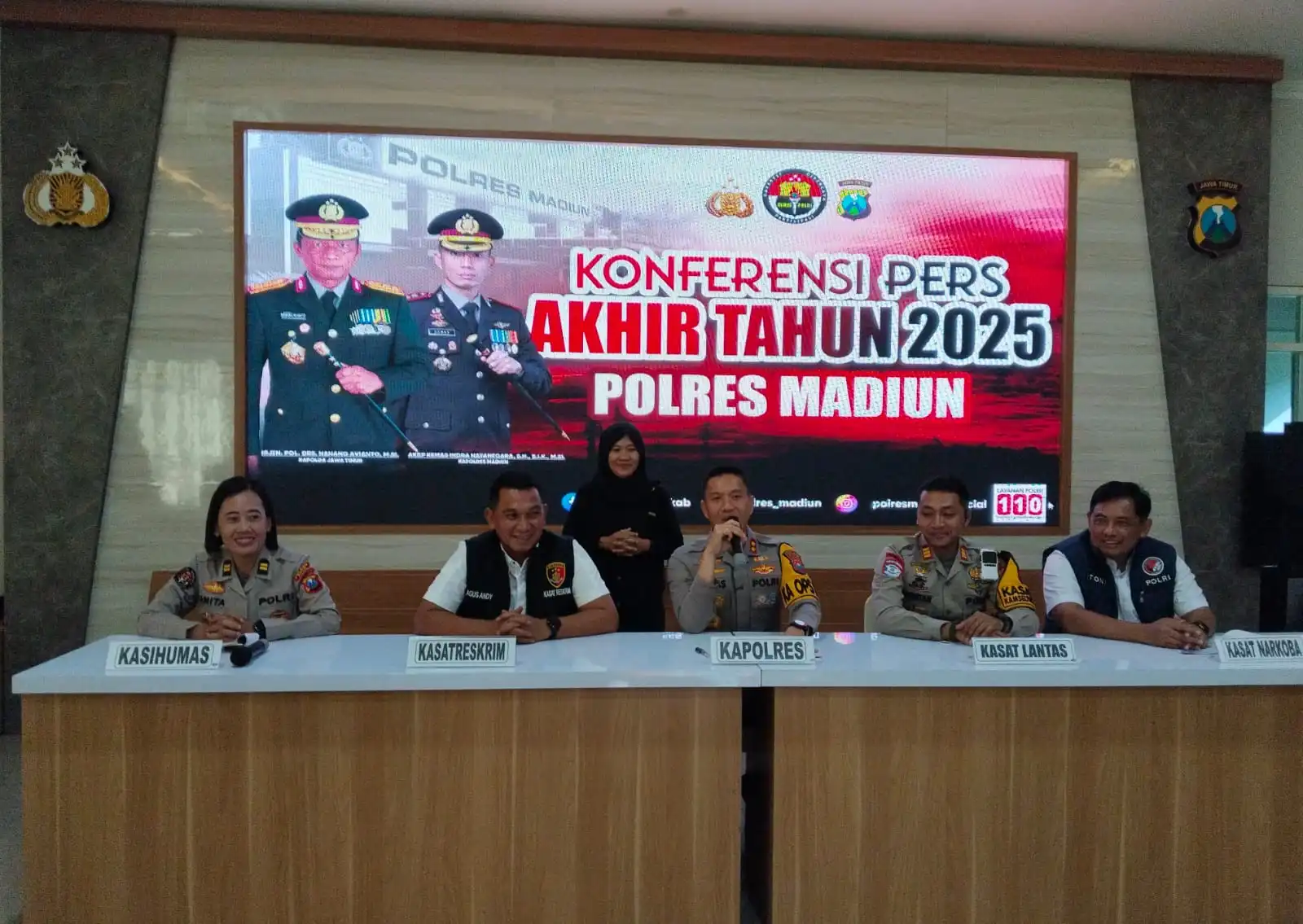 Dalam konferensi pers tersebut, Kapolres memaparkan evaluasi kinerja Polres Madiun sepanjang tahun 2025, mencakup penanganan kasus kriminalitas, narkotika, serta pelanggaran lalu lintas.